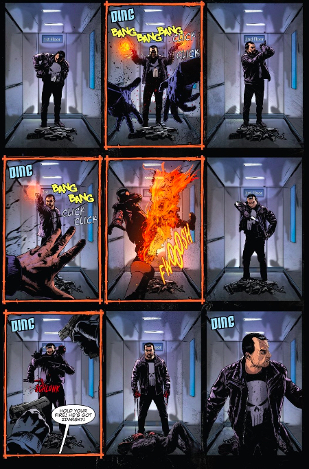 Punisher may be surfing a bullet tsunami, but these three are tangled in some boardroom bullshit. Kudranksi usually trades in almost impressionistic depictions of action, just giving the reader the goriest bits of what’s happening from moment-to-moment, but he decompressing the storytelling here to such a remarkable degree that Agger saying “Baron. A Word?” is the most “action packed” beat on the page. That’s what the evil dudes look like when we freeze them in decompressed storytelling mode. What’s Frank look like?
