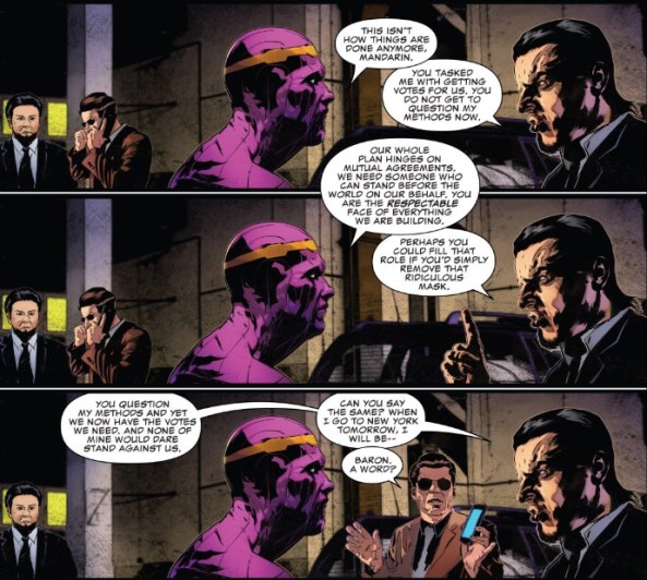Rosenberg and Kudranski are making the argument that the difference is mostly aesthetic. Mandarin even gives Zemo shit for insisting on his stupid purple mask, which Kudranski draws extra-loose fitting for maximum ugliness. This is actually one of my favorite scenes in the whole issue: these three global super villains arguing about votes, strategy, responsibility, appearance — then then being interrupted by a phone call.