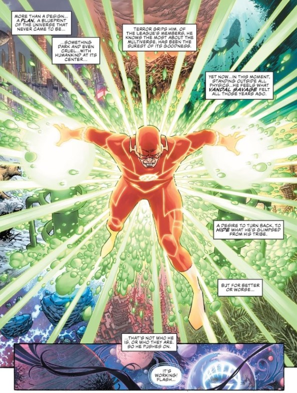In Justice League 7, meanwhile, Scott Snyder and Jim Cheung take “creation” literally, giving Vandal Savage, Lex Luthor, and the Flash all glimpses into the Totality and the blueprints to all creation contained within. Each initially comes to the same conclusion — that there’s something cruel and rotten inherent to the creation of the universe and the Totality’s plans for it — but these facts eventually lead each man to take wildly different actions. Savage tries to hide the truth of the Totality from his tribe, his desire to protect them eventually twisting into a desire to rule. Luthor embraces the Totality’s darkness, deciding that “doom” is the only logical, natural direction for mankind.