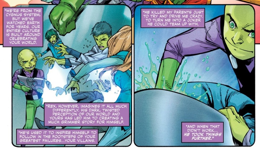 There’s probably a cautionary tale to be told here about relying too much on media to educate and guide our children, but Peter Tomasi and Carlo Barberi don’t learn too hard into it. In fact, Joker Jr. later says that their entire culture is designed to celebrate Earth and its heroes — for whatever reason, Rex Luthor just doesn’t see it that way.