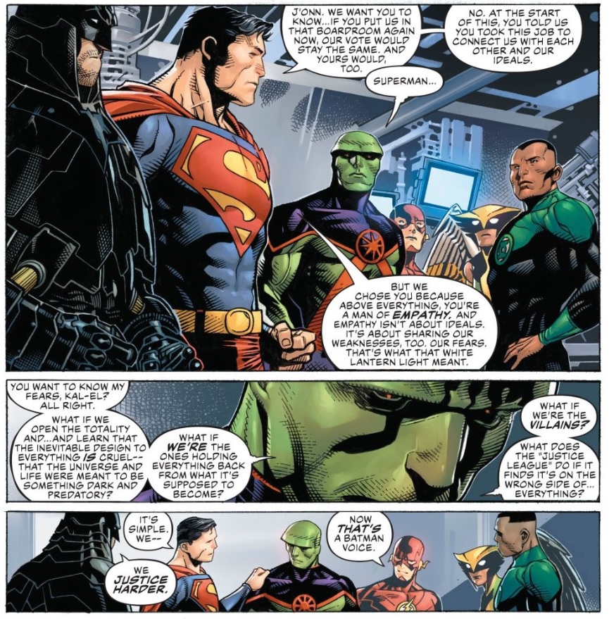 In real life, none of us have seen into a Totality and glimpsed the blueprints of the universe; what we learn about life and mankind and the world we learn through our experiences, and those experiences lead us all to many different conclusions. I can understand why many think that life is suffering, and that the universe is cruel, but I also agree with the Justice League; if that’s the truth, than it’s a truth I’ll fight against with everything I have.