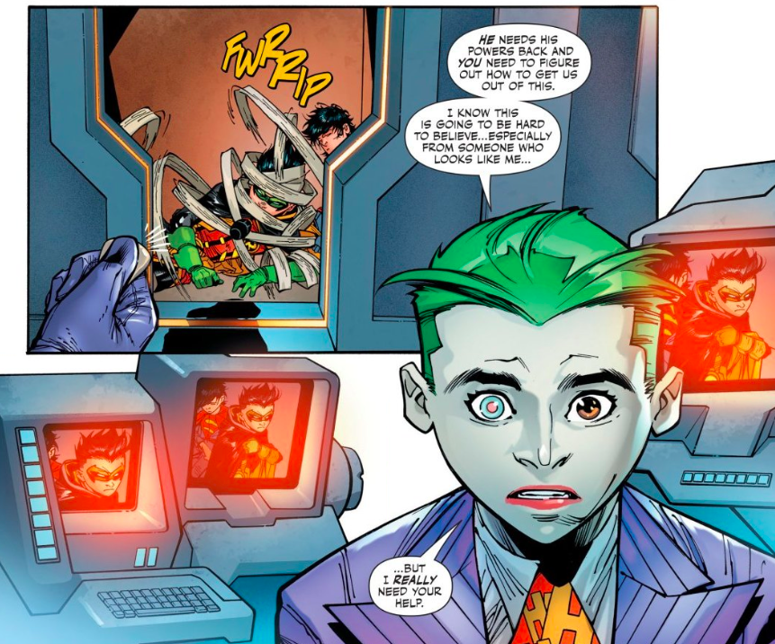 Spencer already posted this image above, but what struck me most about Rex’s villainy was how intent he was on making Joker Jr. a credible Joker — IE completely insane. JJ explains to Robin how Rex killed his parents to make him go mad — his own personal Killing Joke, if you will. And while Rex may not have succeeded in making an evil, insane mini Joker, he did make one that is just as unpredictable. I’m of the mind that you can never trust the Joker in a team setting, which is true here, as JJ is the one that ultimately helps our Super Sons.