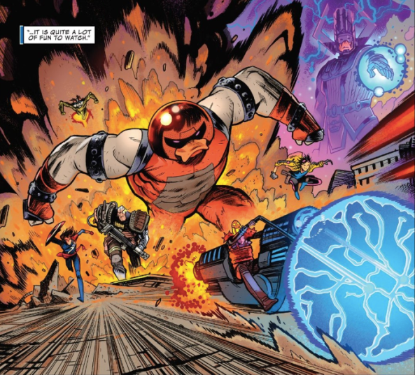 It’s marvelous stuff, and Cates takes a second at the top of the issue to revel in excitement that stems from the novelty of it all. Uatu the Watcher stares directly at the camera in the opening splash page, jubilantly laying out the concrete details of this issue’s set-up. Uatu tags the whole thing with “…it is quite a lot of fun to watch.” That bit of narration plays out over a panel that is designed to be just that: fun to watch.