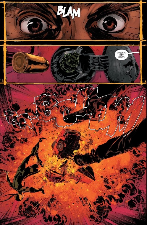 Rosenberg and Kudranski even do the now-familiar trope of someone taking cell phone footage of the hero-at-work, but now it plays on the news with a disclaimer about the graphic imagery. I don’t know about y’all, but that brings back memories of news articles with embedded videos from the Parkland and Las Vegas shootings. In short, the creative team isn’t letting Frank off the hook here – he’s doing something terrible, and they want to remind us that he’s a living embodiment of the specific kind of violence that seems endemic to the United States in the 21st century.