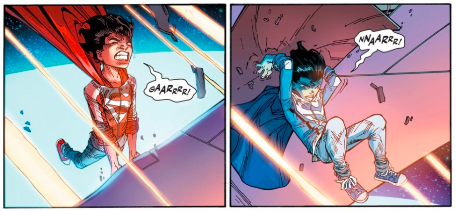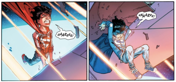 Though they spend the majority of the issue opposing each other in some way, the two Superboys ultimately agree on their feelings towards Robin. While Tomasi is throwing some high-concept split metaphors at us, he doesn’t forget what makes this series work: the love/hate relationship between The Boy Wonder and The Boy of Steel.