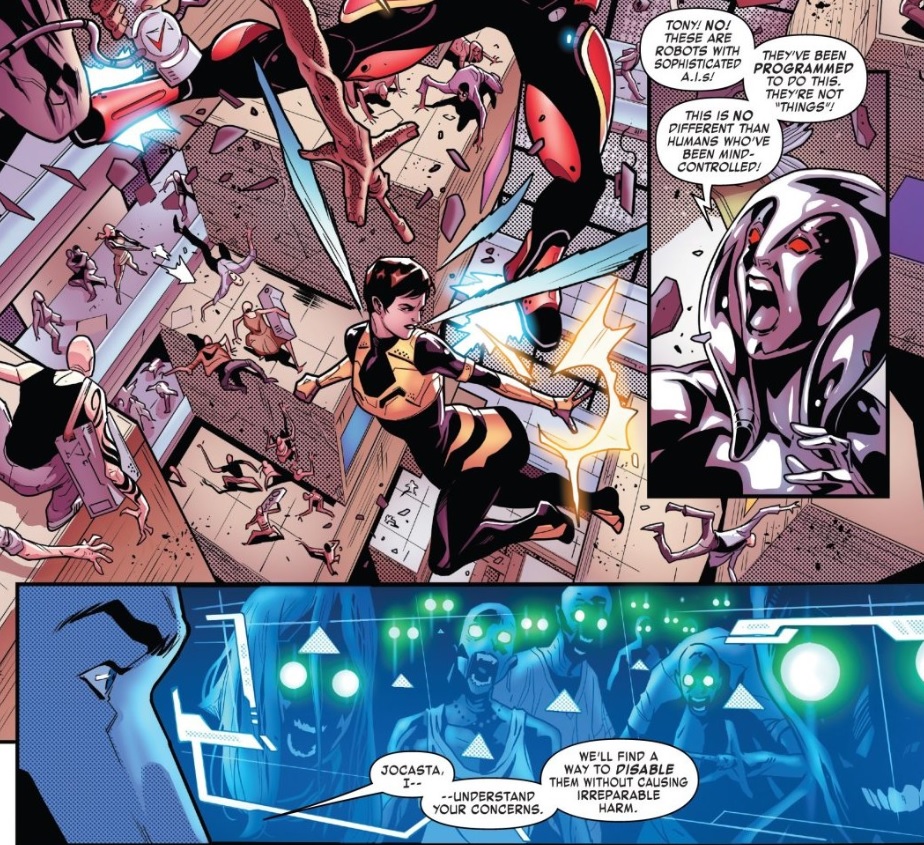 Here, for example, Tony is clearly frustrated — if only for a split second — that he can’t just smash his robotic opponents. But Jocasta is a trusted member of Tony’s team, and thus he respects her opinions, and ultimately taking her concerns into consideration allows Tony to come up with a much simpler, more elegant solution to their problem.
