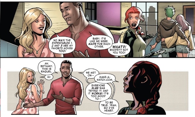 It’s the fact that everyone’s matches are “too” perfect that eventually tips Bethany off to Make-A-Match’s deception, but Make-A-Match’s idea of “perfect” matches are dates who are essentially just copies (or distaff counterparts) of their victims. Rhodey and his date aren’t truly compatible in a deep way, they’re just similar; Make-A-Match is using his individual tastes against him instead of celebrating them or creating their own complimentary ones. They don’t understand what makes people click, how people can come together to be stronger and better than the sum of their parts. Stark Unlimited does, and that’s why they eventually come out on top.