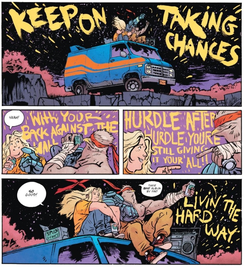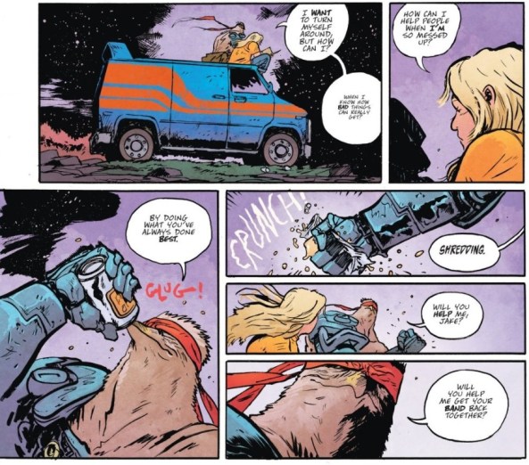 Murder Falcon tells Jake that the best way to turn himself around, to help himself and others, is to keep shredding, to keep making music. The way his music helps others can help him as well, of course, but Falcon is also pointing out that just the act of playing and creating music can be enough to help him move forward. In his afterwards, Johnson himself talks about playing music has always helped through his hardest times. As someone who’s grown up around the pop-punk and emo scenes, I’ve seen artists share their darkest secrets and innermost torment through their music in an attempt to exorcise their own personal demons, while in a genre like Murder Falcon‘s beloved metal, sometimes just shredding away on the guitar is enough to work out the frustration. No matter what, it’s the power of music, and it’s unparalleled.