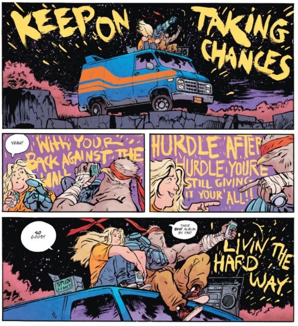 Jake was a talented and successful guitarist until he fell into despair after the death of his wife. After a monster attacks him in his apartment, though, he’s rescued by a being known as Murder Falcon, who reveals their symbiotic relationship — the better Jake plays guitar, the better Murder Falcon is at fighting monsters. The metaphor here is pretty clear; just like Jake’s music literally gives Murder Falcon power, in real life music has the same ability to help strengthen its listeners. Johnson highlights this ability in multiple ways, both big and small, throughout the issue. Besides Murder Falcon himself, there’s also the waitress, Peggy, who tells Jake how his music “really brightens [her] day.” Then there’s also this wonderful scene, perhaps my favorite in the issue.