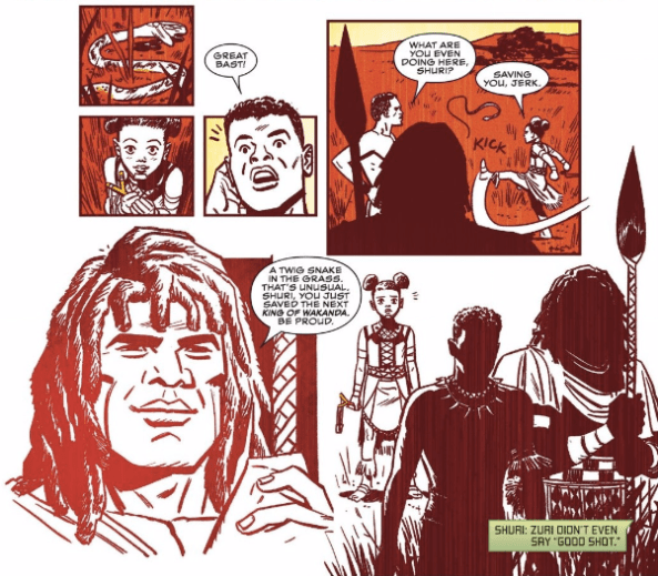 Additionally I like when artists add a unique flair to flashback scenes, such as the one Spencer mentioned above. T’Challa, Shuri and Zuai are cast in a pale white to contrast from the orange and reds of the background and foreground. The moment that the snake begins to strike however, these colors are swapped. In a flash of panic, T’Challa’s face is blush red and the background and foreground disappear to leave a blank space of white panic.