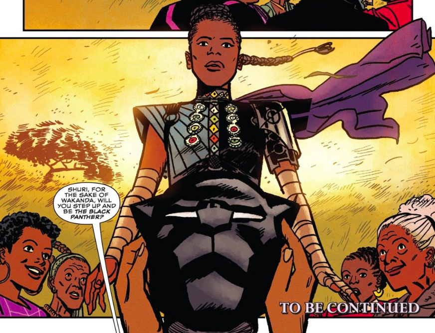 I know Shuri’s story is “just getting started” but I can’t help but think of how fleeting and impermanent her time as Black Panther – if she indeed takes on the role – will be. T’Challa will eventually return to put his kitty claws back on, so Shuri’s tale is not “This is the Black Panther forever and ever” but rather “how once again becoming the Black Panther will affect Shuri.”