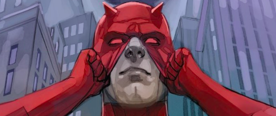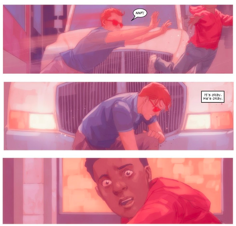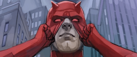 Finally I wanted to comment on Phil Noto’s artwork. Noto has been a frequent partner of Soule’s on Daredevil and other titles, but his style is noticeably different here. In previous issues Noto’s colors were solid and lifelike – impenetrable to the light. In Daredevil 609 however they are more fluid, as if in watercolors.