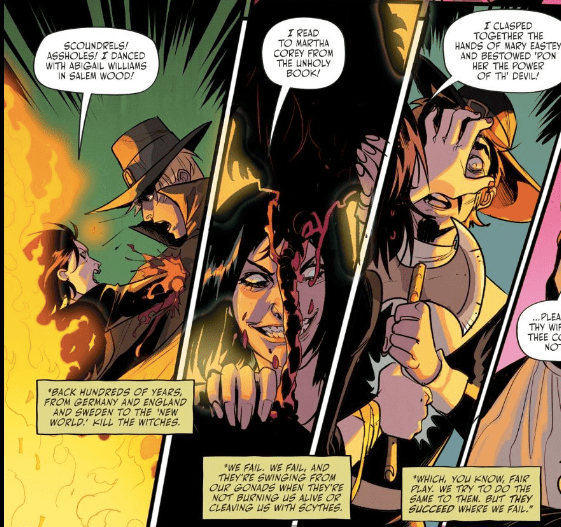 The issue is basically split up into “before” and “after” sections. In the “before” portion, which smartly takes up the first half of the issue, a coven of witches wages unending violent war with the Gabriel family. Maybe “war” isn’t totally accurate – the Gabriels are always the perpetrators of the violence and the witches always defend themselves. Those defenses are usually soaked in gore and fire, emphasizing the women’s connection to their dark lord’s infernal powers.