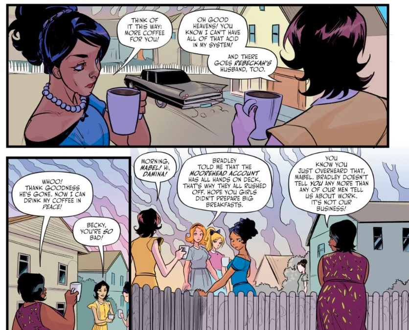 They kill, they die, they are reborn and eventually remember who their true selves so they start the cycle all over again. Over the next several pages Blacker and Andolfo take us through multiple reincarnations through the decades, including the Gabriels plotting by the fireplace. After the three year time jump we find ourselves in Stepford territory, with the witches domesticated to be model housewives.