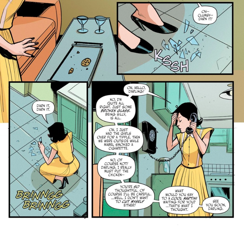 As Aaron mentions earlier in the issue, the witches rely on “blood magic.” When Isadora drops the martini glasses she begins to pick them up by hand. At that exact moment the phone rings and she stops what she’s doing.