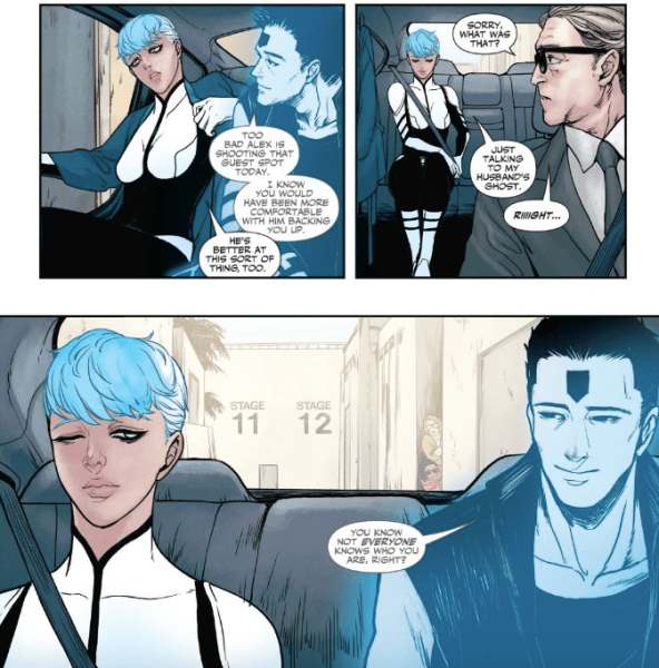 The issue starts off with Faith and Monica seeking help, which is a good first step in acknowledging that Zephyr is ill-equipped to deal with the situation. Monica is beset nightly by ghosts, so they naturally reach out to para-psychologist Doctor Mirage. But Dr. Mirage isn’t even offered her normal, comfortable, setting – instead she’s being interviewed on a talkshow to promote her new ghost-related show. It’s complicated and artificial and weird. Every part of Doctor Mirage’s experience on the lot suggests that she doesn’t belong there: there’s the forced laughter at joke she’s heard a thousand times and she stumbles over comparing her ghost-husband to bacteria. Even the way she nonchalantly tells her driver she’s talking to her husband’s ghost reveals that she’s just not in her element.