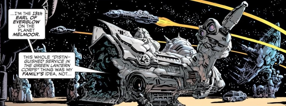 The Green Lantern 1 opens on a small group of Lanterns apprehending a crew of Space Pirates in deep space. The scene largely focuses on a Lantern we later learn is the 13th Earl of Everglow on the planet Melmoor, and he’s as snooty as his title suggests, bemoaning the lack of clean bathrooms on the planet and referring to one of his pirate opponents as a “savage.” Everglow’s fellow Lanterns don’t seem all that fond of him, but they do seem to share at least some level of his prejudice, or at least his derision of the people around them, with even Trilla-Tru laughing at their idiocy.