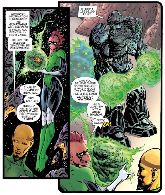 As for the pirates, they were stealing “Luck Dials” from the “Luck Lords of Ventura,” crime bosses who use the dials to rig probability in their favor at their casinos. While the Lanterns are trying to keep the pirates from using the Dials to hurt innocents, they don’t seem all that concerned about the Luck Lords using them to do the same, and in one scene Trilla-Tru almost seems like she’s reporting to them. This highlights the limitations of the Lanterns’/police’s “lawful good” status — it doesn’t help to uphold the status quo if the status quo is inherently harmful and unfair.