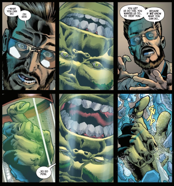 Ewing and Bennett continue to blend the superhero and horror genres here as Hulk’s body reconstitutes itself. There are a couple different Cronenberg-esque, body horror moments in The Immortal Hulk 8. It’s hard to pick a favorite to be honest, but I think I’ll go with this one: