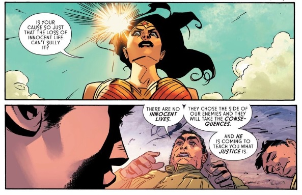 These two panels fall on two different pages in the issue itself. Though there’s no real change in light or environment, colorist Romulo Fajardo Jr. still makes drastic changes to his pallet between the two. The page where Diana arrives is bright and bold, while the background starts to become shrouded in dark purples in the second panel, which seems to show Ares’ pall falling over them all. This stark contrast in color seems to represent the stark contrast between Diana — who will fight for all innocent lives — and Ares — who believes that no life is truly innocent if they side against a supposedly just cause. Diana as a character considers peace, reconciliation, rehabilitation, and justice all as core values, so it should be interesting to see how she tries to stay true to these while dealing with Ares, an opponent she will no doubt be able to see good in, will no doubt want to save, but will also likely be wary to trust, and whose methods she abhors. “Is there such a thing as a just war?” is a juicy enough conflict to begin with, but when both sides have such a personal and moral stake in the answer it becomes even more compelling.