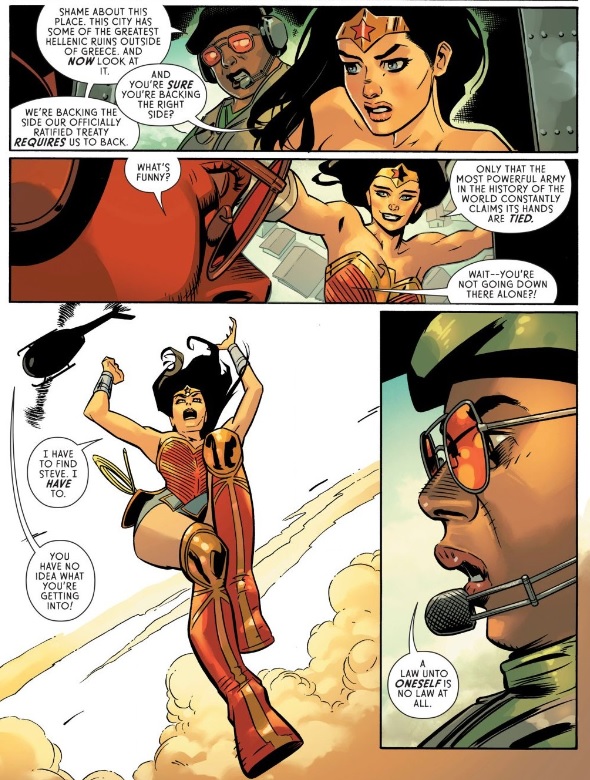 Intriguingly, that implementation is already quite complicated. It’s easy to imagine Diana’s attitudes about war being entirely black and white (as countless other writers have depicted), but that’s not quite what we get here. Diana is as concerned about protecting innocent lives as ever, but that doesn’t manifest as a naive anti-war stance. Indeed, it’s the US Military that holds that naive view. That is, the view that aggression is inherently bad, and thus justifies force against it, is both too simplistic a view and too hypocritical in Diana’s world. This issue doesn’t suggest that Diana is particularly sympathetic to either side — fighting oppression vs. maintaining “order” — and instead finds her intervening in situations where (seemingly) defenseless people are under attack.