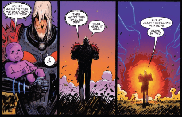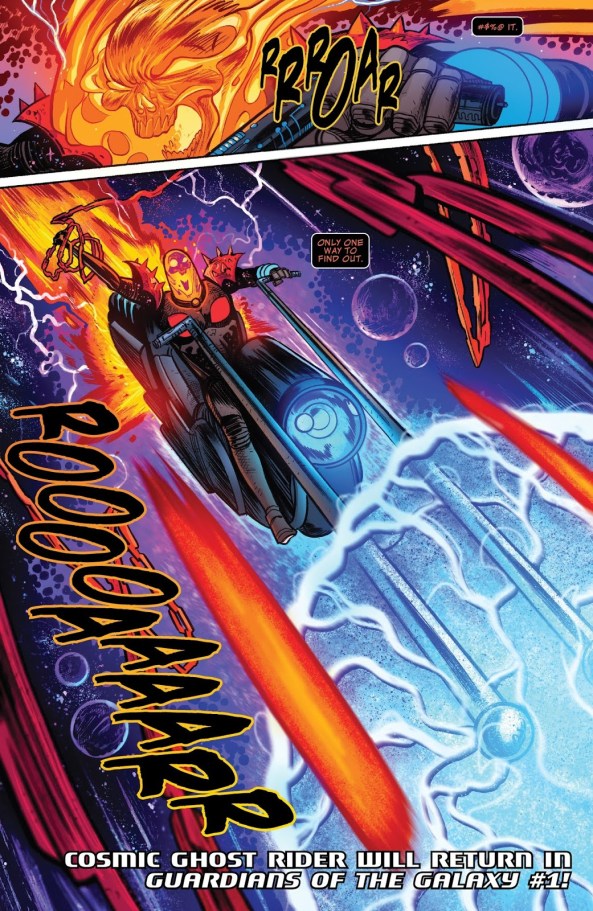 And it’s the verb in that clause that actually makes this Frank Castle’s lowest point. Kill. The one thing he set out to do was teach Baby Thanos that killing was wrong. But, like, what else was Cosmic Ghost Rider supposed to do? Burnett’s panelling returns to right angles and rectangles, even as the issue heads for false ending, and father and son ride off into a not-sunset sunset.