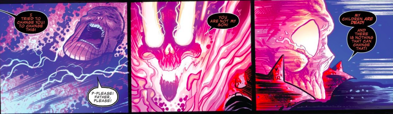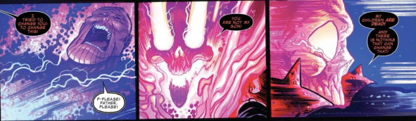There’s a lot happening in this sequence. Frank is coming to the realization that of his hubris in trying to reform the Mad Titan, admonishing both Thanos and himself. Dylan Burnett throws a lot of emotional on that flaming skull, with a cosmic tear escaping his “eye” as he feels a sense of betrayal on behalf of his actual children.