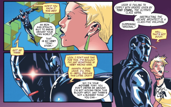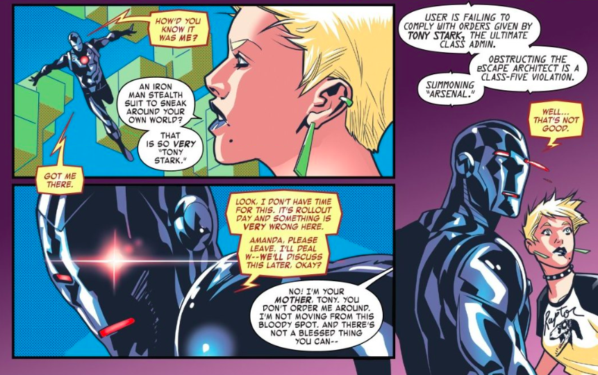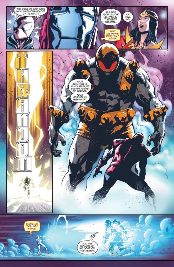 Tony’s digital security enforcement comes in the form of a roided-up behemoth known as “Arsenal.” Early on in the issue Arsenal shows up in a bolt of lightning to oust an eScape user for using profanity and therefore failing “to abide by community safe space codes.” It’s a noble effort on Tony’s behalf, but as the FCC has known since the internet’s inception, it’s hard to police the internet.
