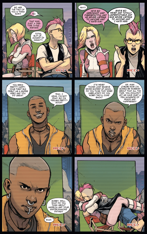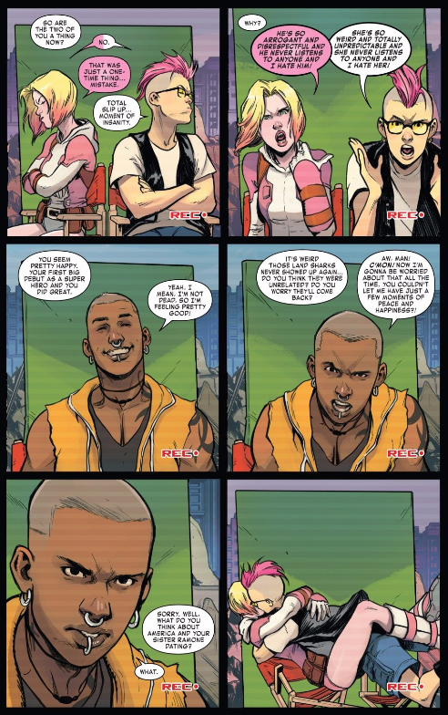 1. The one thing that bothered me about this issue was the meet-cute/dating bit with America and Ramone. The actual mute-cute was cute enough, I’m sure the pairing could be fun — but doesn’t Ramone already have a girlfriend? Didn’t she already appear in ISSUE ONE of this series? I know that poly and open relationships are a thing, and they could have broken up, but without clarifying why Ramone is suddenly open to date America, I wasn’t able to get the laughs and fuzzies out of it that I was clearly supposed to. I was too busy trying to figure out how it was even possible (or, gasp!, if she was cheating)