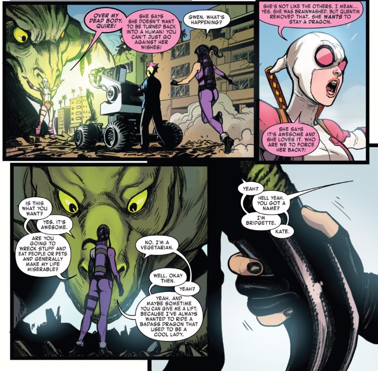 Nope; this is quite possibly the key moment of the entire issue. B.R.O.D.O.K. treated Bridgette and the other girls like objects rather than people, altering their bodies against their will and robbing them of their ability to make choices at all. In contrast, Gwen defends Bridgette’s right to choose, and Kate likewise allows Bridgette to make this momentous decision because, well, who is she to tell Bridgette how to live her life?