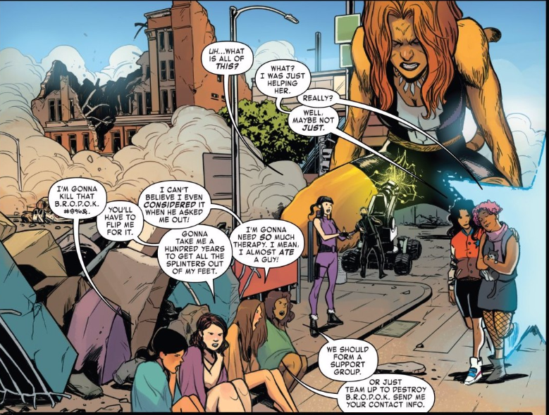 This is the West Coast Avengers once again embodying the kind of behaviors that serve as an antidote to toxic masculinity, just as they’ve done throughout this entire storyline. Even Kate and Tigra’s choice to wait until after the battle to undo the transformations B.R.O.D.O.K. put them through is one that returns to them the agency B.R.O.D.O.K. robbed them of, and they’re decisions Clint and Quentin are happy to back.